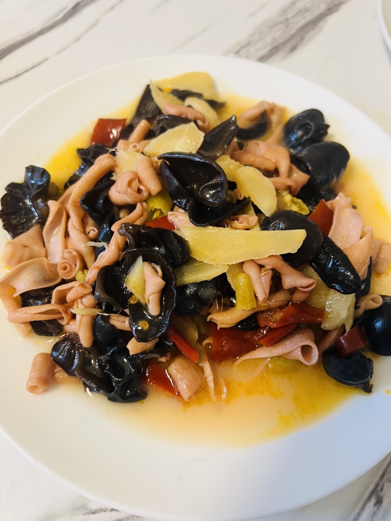 5:倒入鸭肠,翻炒,倒入泡椒水,加入糖,炒约2分钟,即可出锅。