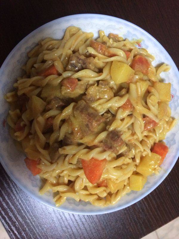 5:将煮好的螺纹粉和咖喱汁烩一下!好啦,这是出锅后的成品,是不是很漂亮了