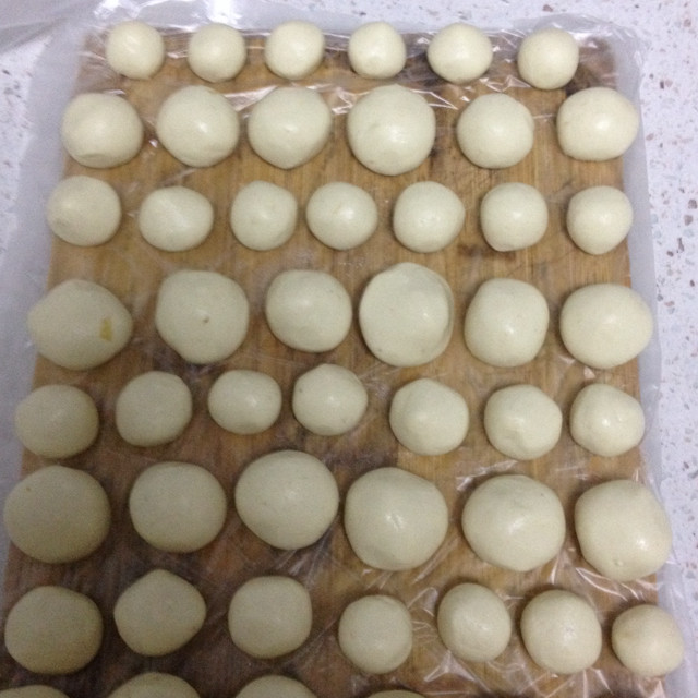 1:糯米粉倒入碗中,加适量炼奶和水,搅拌成面团。揉搓糯米面团,揉成一个个均匀大小的小丸子状。
