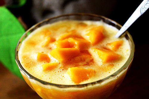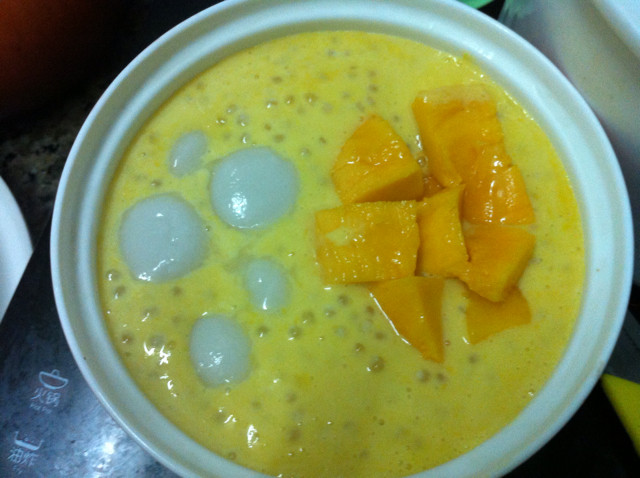 4:牛奶中加入制做好的小丸子,加入事先切好的芒果粒。