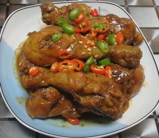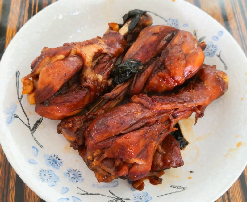 7:放入炸好的鸡腿,翻炒至鸡腿表面均匀的粘上汤汁盖上锅盖,用小火焖10分钟到15分钟左右。揭开锅盖,改用大火收汁儿,放入葱花炒香就可以出锅了。