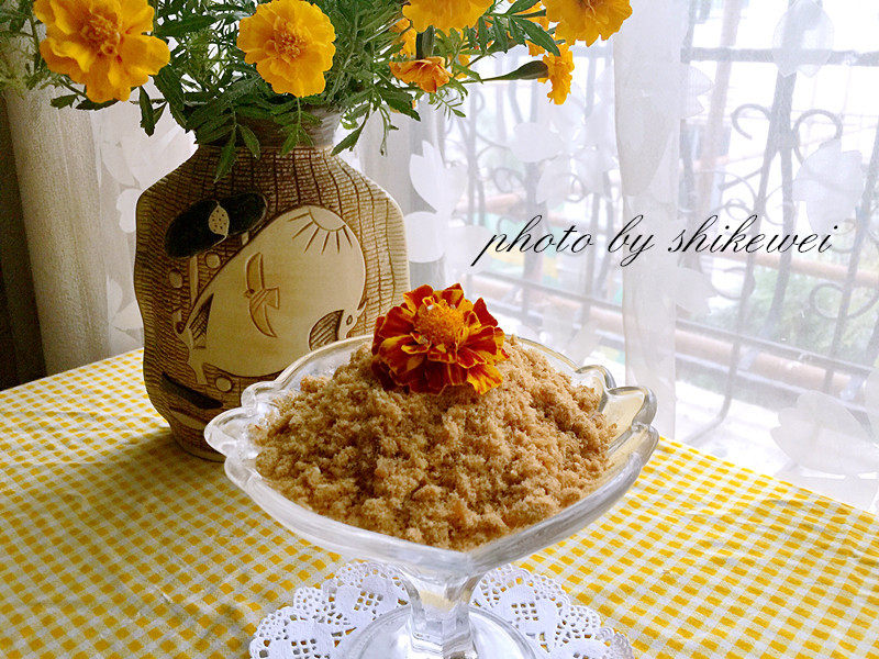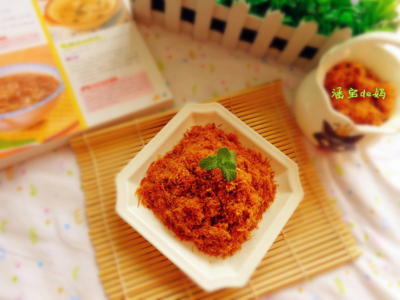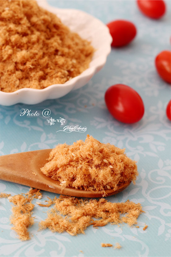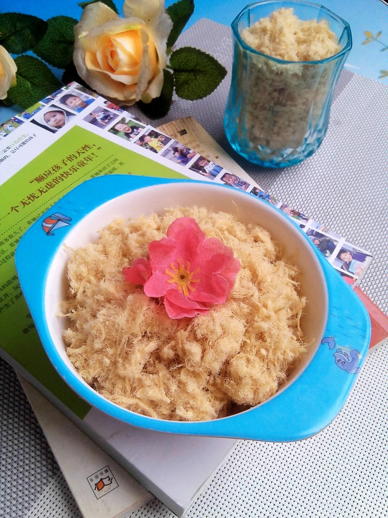 10:成品的肉松出来了..我们放到一个宽大的烤盘里凉一凉.....然后就可以装入密封的保鲜盒里冷藏...想吃的时候随时取出了.......