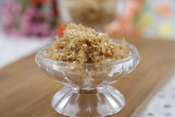 5:炒锅烧热,然后放入肉末小火慢慢炒制,加入白芝麻一起炒,到肉末变得毛茸茸时就肉松就好了。
