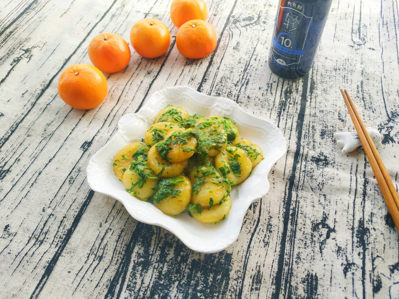 1:准备食材:土豆去皮事先蒸熟,荠菜摘掉老叶洗净。