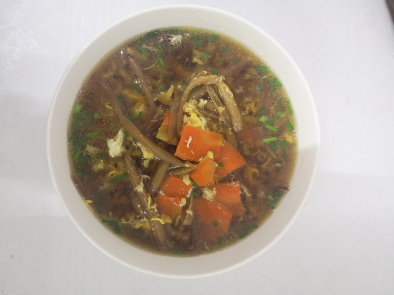 3:再倒入煮锅内,加些胡萝卜片,加入盐,油,打入鸡蛋后鸡蛋变色就关火,鸡蛋煮就不好吃了,加少许鸡精调味。