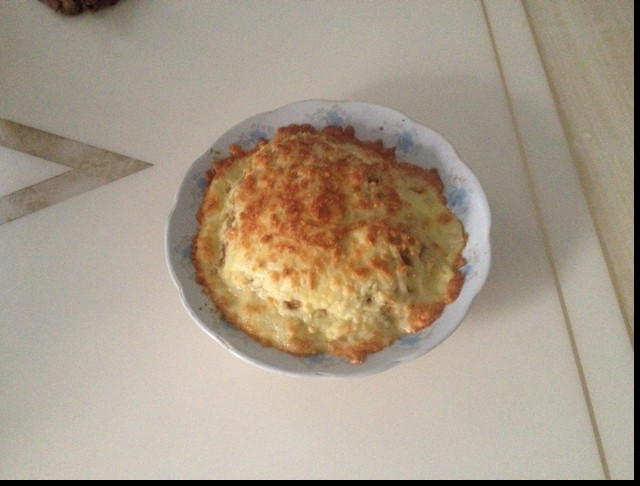 18:烤箱220度预热,之后放入耐热容器,烤三四分钟,这时不要离开烤箱,奶酪表面出现黄色的点点时,就立马拿出来。