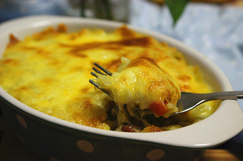 7:放入焗盘里,满满的铺上一层马苏里拉芝士和切达奶酪的混合奶酪,(如果没有切达的只放马苏里拉也可以,芝士没有这样混合的香而已)放入烤箱190℃上层10min左右表面上色即可,