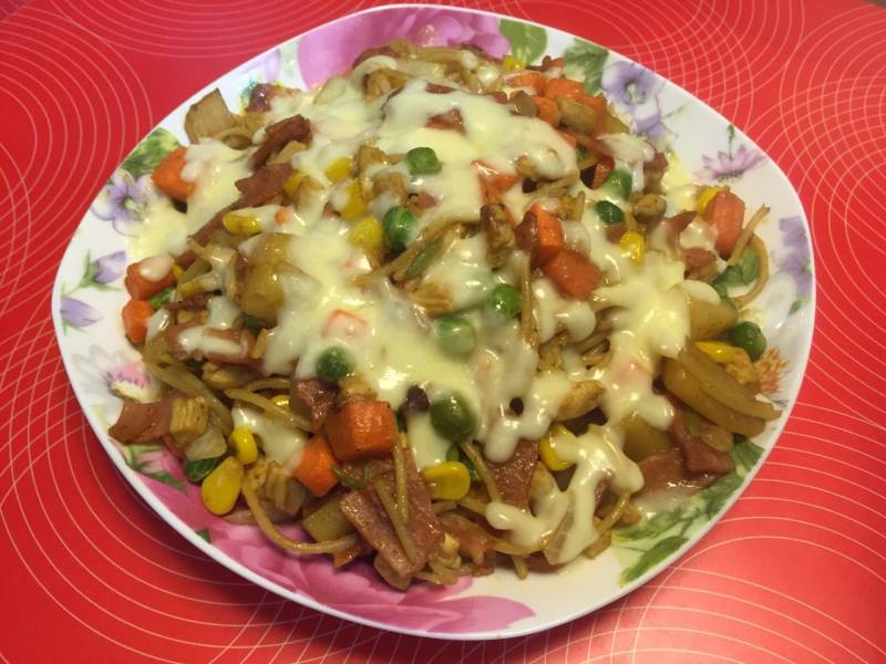 青豆10g;玉米10g;胡萝卜10g;培根2片;苹果10g;洋葱半个;芝士20g;鸡肉20g;意面100g;