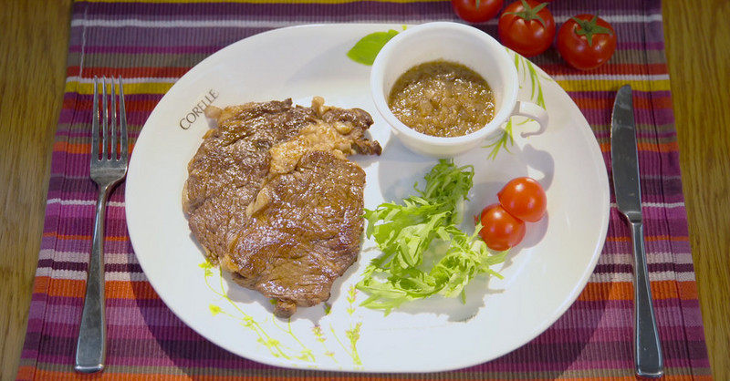 1:将牛排用肉锤或刀背敲至断筋。
