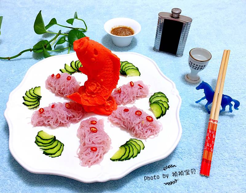 13:缠好的胭脂粉丝扣摆入盘中搭配扇片黄瓜和小红辣椒更美噢