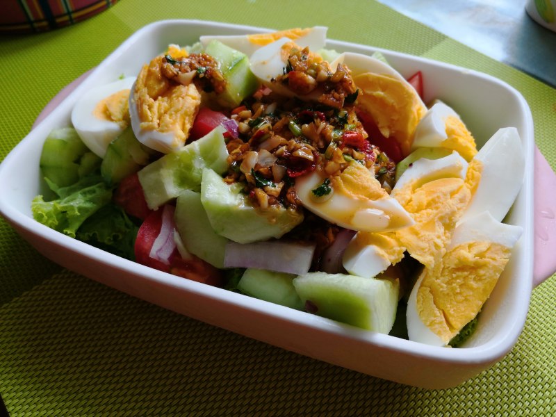 2:小生菜撕成小块,黄瓜拍一下切块,西红柿切块,鸡蛋切成小块,紫洋葱切小段放在盘子里。