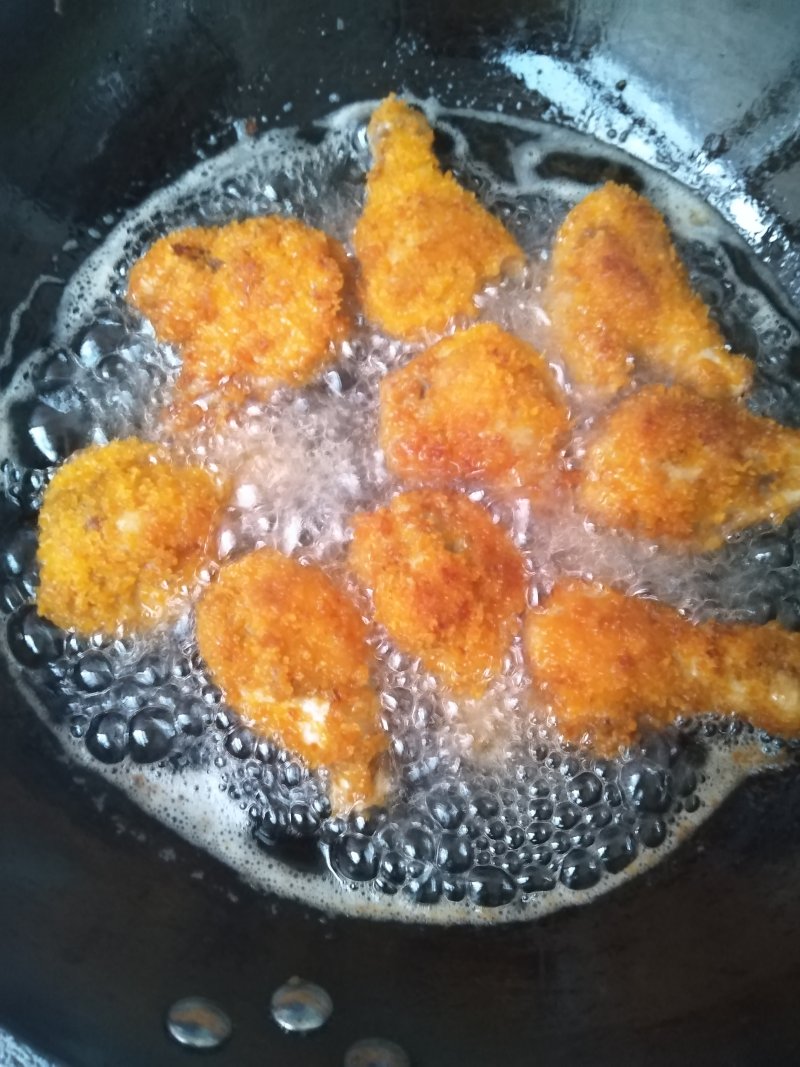 9:待全部鸡翅都裹好后,开始炸制。往锅中倒入适量的油,油热后,将鸡翅放入锅中,炸至成熟、表面微黄时捞出。
