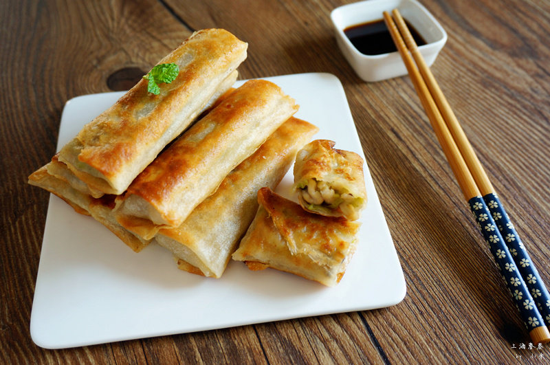 白菜叶6片;香菇8朵;冬笋1个;肉丝150g;春卷皮适量;