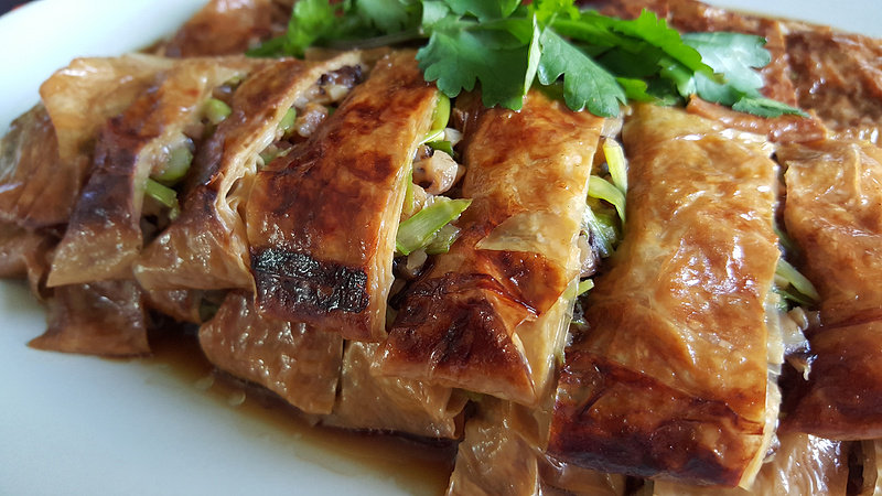 7:再向上翻折,类似春卷做法。为增加口感也可用两张油豆皮来包,每张上面都抹上料汁。