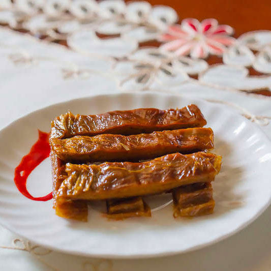 3:整包豆腐皮都依次叠好后卷起来,可用棉线扎起来固定防止后面煮时散开