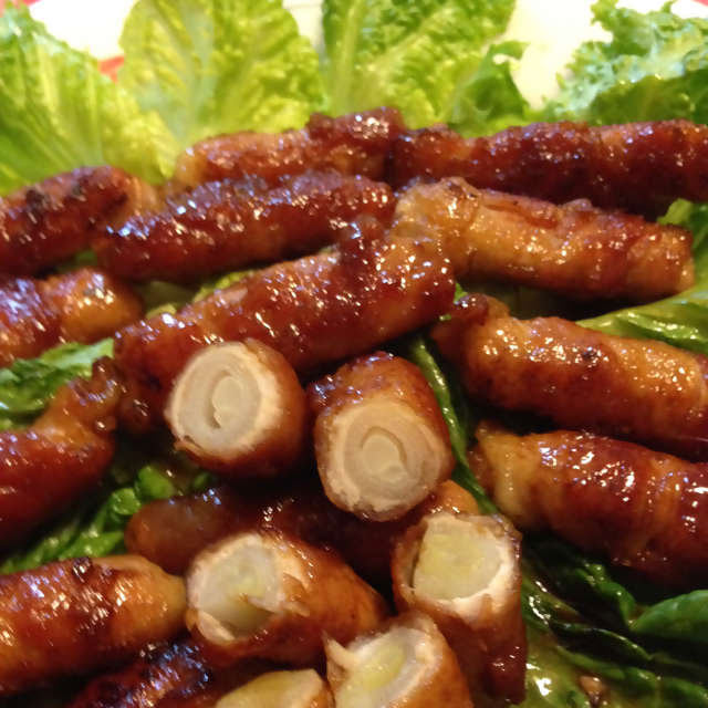 1:把大葱切成和肉片一样的宽度,(猪肉片最好使涮肉用的,大葱不要超过肉片的宽度)卷起来