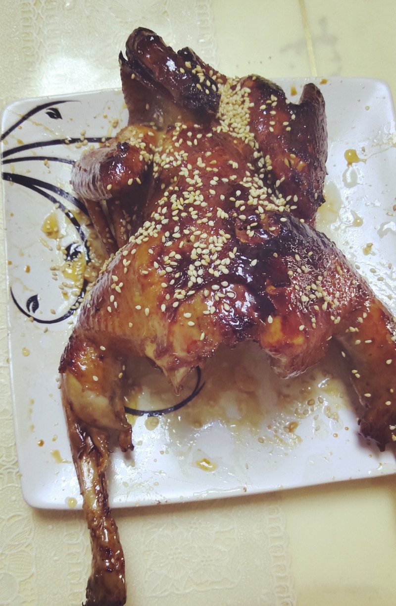 3:出锅晾干,锅中热油加入两大勺蜂蜜熬的粘稠颜色变红,出锅,等鸡晾干刷上蜂蜜汁,不放过每一个地方。