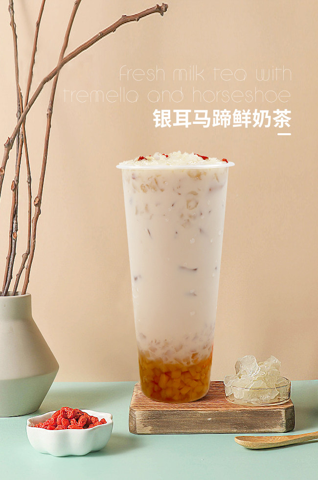 银耳口感滑而不腻,马蹄肉自然清甜,搭配丝滑的奶茶口感更佳。女性朋友吃银耳还可以保持美容嫩肤,有补脾开胃、益气清肠、滋阴润肺的功效。马蹄有生津止渴、利肠通便、清肺化痰等功效,北方人视之为江南人参。