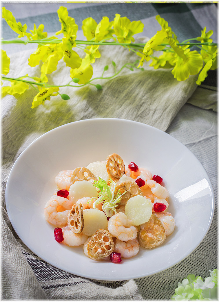 5:加入藕片继续翻炒,也可以不加藕片最后放。调味就是一点盐,味精和糖,咸味不可重,吃虾的鲜甜即可。最后撒点石榴点缀一下。