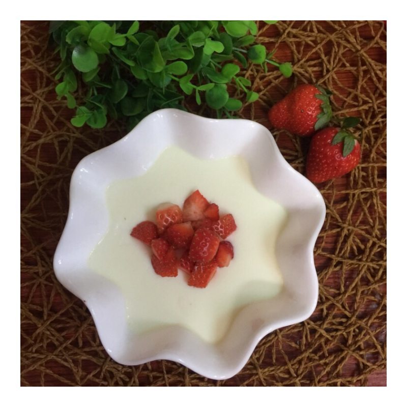 9:端出放凉,在上面摆一些自己喜欢吃的水果即可。双皮奶入口即化、爽滑细嫩、奶香浓郁、甜而不腻。