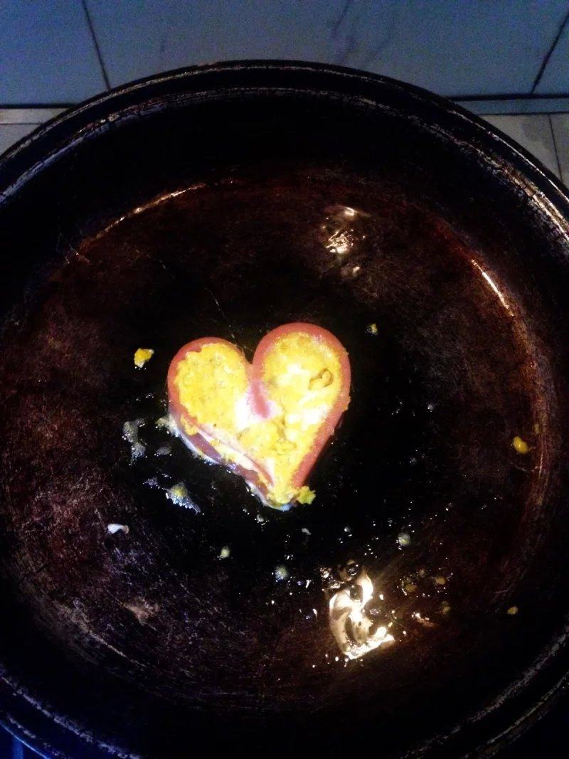 7:平底锅放油,放入心形火腿肠。