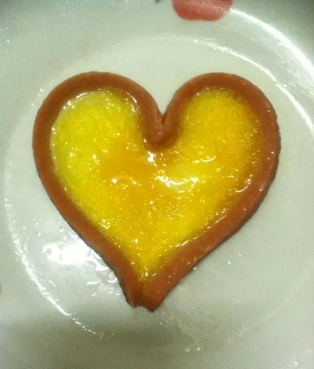 2:我的经验是火腿肠要开小火慢慢的煎,这样既不会焦,又使火腿热透,慢慢的变软,对于下一步把它分开圈成爱心有很大的帮助