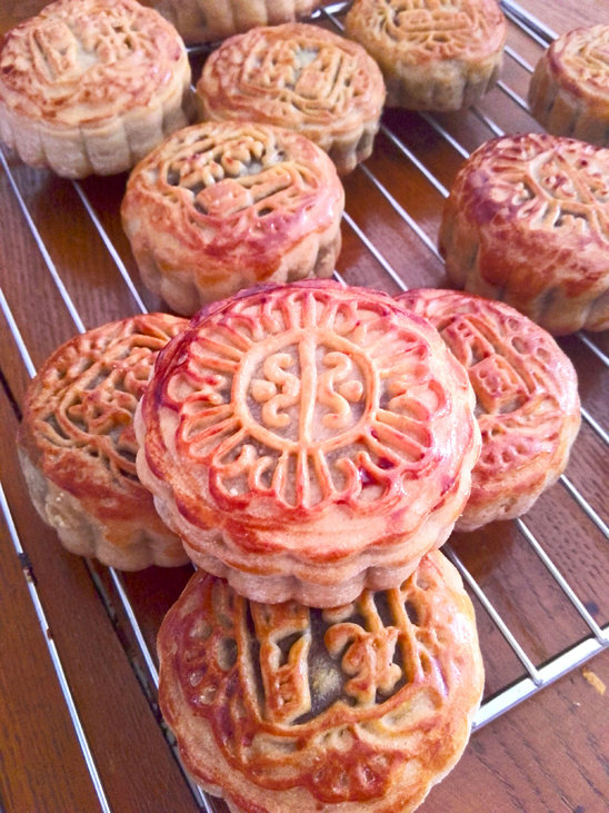 1:这是刚烤好的月饼,还冒着热气呢,屋子里到处充满着月饼特有的香味,看着色香味俱全的月饼,是不是想有咬一口的冲动呢,我就没经得住诱惑,刚出炉就吃掉了一个,味道嘛:自己做的,味道当然是最棒的!不喜欢太甜太腻,所以在做绿豆沙馅的时候。糖、油的量都减少了一些,所以口感清淡一些,个人认为更好吃,自己做的好处就是可以制作出适合自己口味的、健康的月饼。