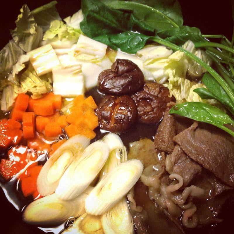 10:最后将煮好的牛肉汤倒入材料锅里,开火煮熟后即可品尝甜鲜的寿喜烧锅(日式牛肉火锅),吃这锅吃完一轮才加材料下去,当全部都吃完后可以用此汤汁煮面或者在汤汁里倒入白饭,美味无比。