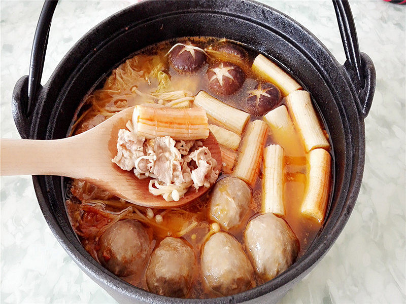 金针菇1把;香菇7-8颗;蟹柳7-8根;牛肉丸4-5颗;娃娃菜1棵;柴火豆腐1块;黄油10克;韩国包饭酱适量;