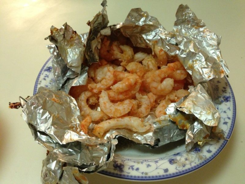 4:用筷子叉开锡纸包,里面香喷喷的虾就可以开吃了.喜欢吃咸点的朋友还可以蘸着酱油吃.不过我觉得就这样可以了,因为焗出来后那种盐香味已经很完美了.拿锡包和刚开出来时小心烫,别让小朋友动先.