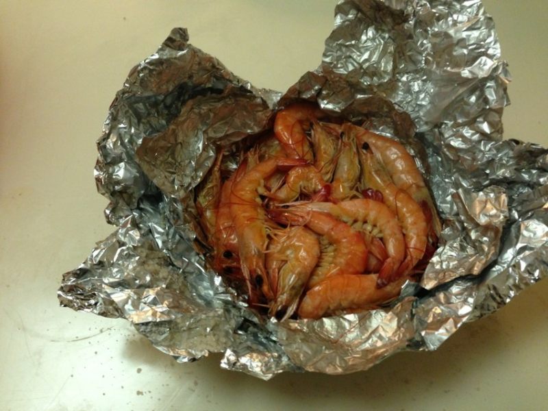 3:剥好的鲜虾仁洗干净,然后给点盐和胡椒粉调味,用锡纸包好.