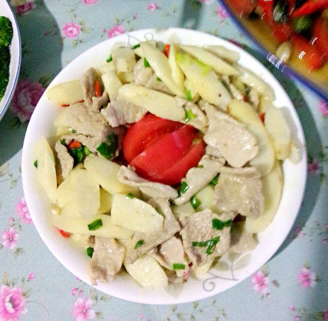 2:内切丝,香约去皮切片,切点辣椒提辣
