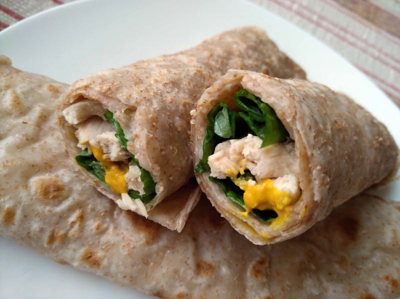 13:饼上放莴笋叶和鸡肉,淋上黄芥末酱。