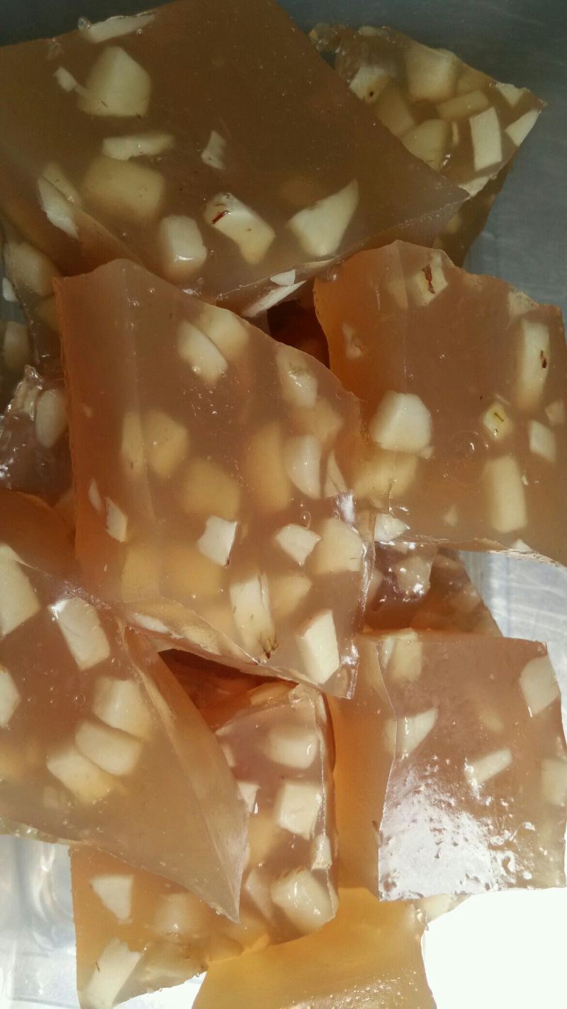 1:马蹄切丁,马蹄粉用水溶解,1kg水加250g白沙糖,上火沸腾后加入2/3的马蹄水,再加入马蹄丁,上笼蒸20分钟,冷却即可