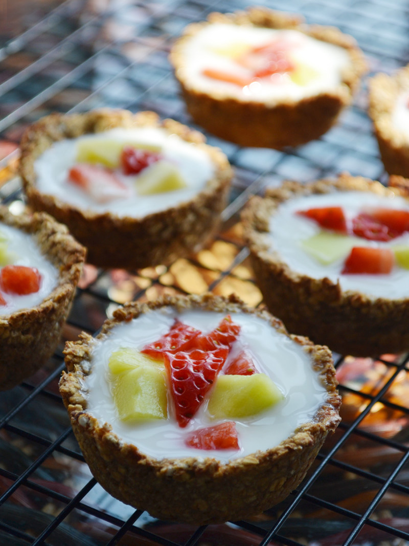 6:马芬模具中抹上油,放入冷藏后的燕麦混合物压紧,中间稍微压凹进去一点。