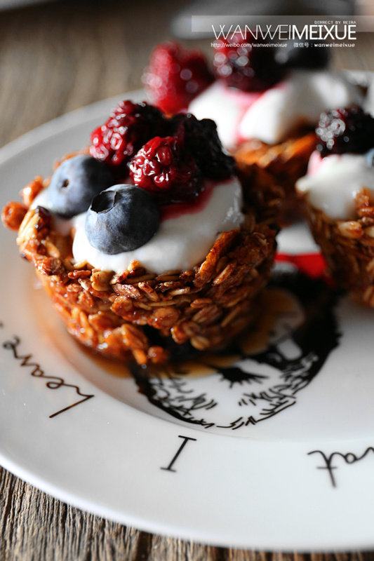 8:放冷后脱模倒入希腊酸奶,点缀蓝莓和黑莓,一个精致可口的燕麦杯就做好了。