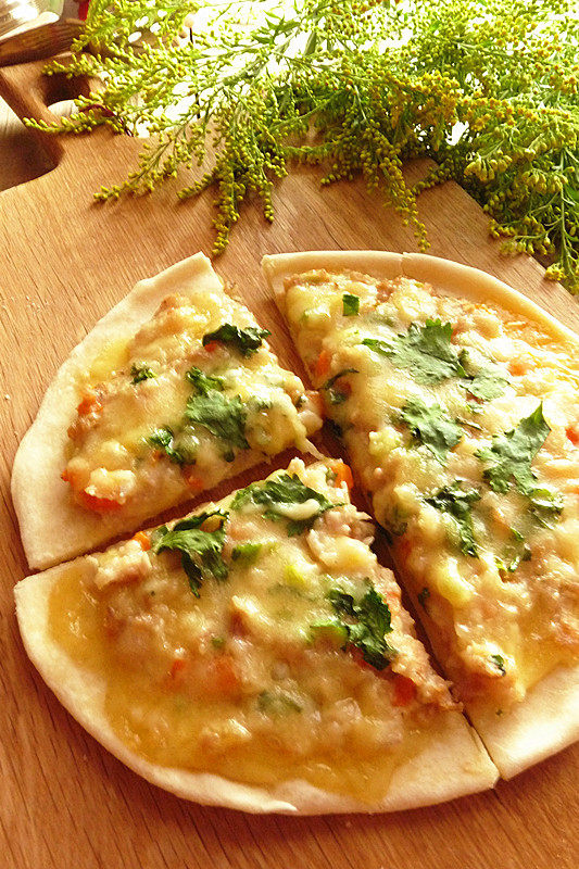1.不许发酵的饼底,做法更简单省时。但是加了黄油,烘烤后底部酥脆,又是另外一番味道。2.披萨的馅料可根据个人喜好,酌情增减,菠萝虾仁等搭配也是极好的。3.因为饼底很薄,所以无需用叉子扎孔透气,也不会出现底部受热不均,向上鼓起的情况。