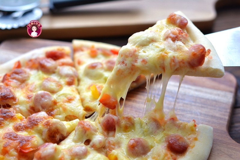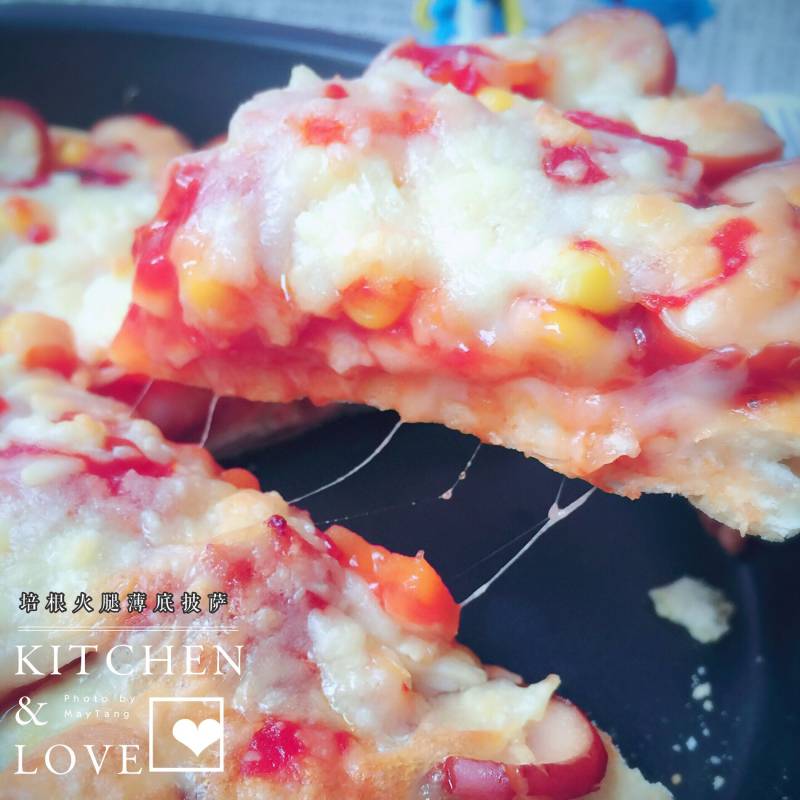 13:接着铺上马苏里拉芝士(忘拍了),然后铺上培根、玉米粒和火腿肠等馅料。