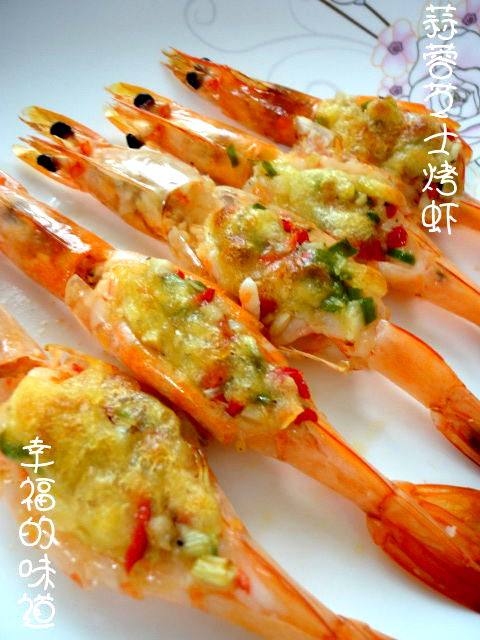 6:把调好的蒜蓉用勺子舀在大虾上面。烤箱提前预热10分钟,上下火180度,中层烤12分钟。