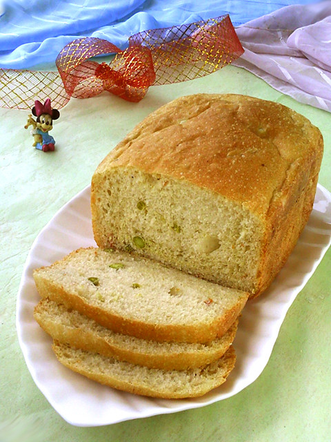 使用面包机制作面包须严格依序投料,以获取最佳烘焙效果。蔬菜粒可以随自己喜好任意变化。面包晾凉后切片更容易切整齐。