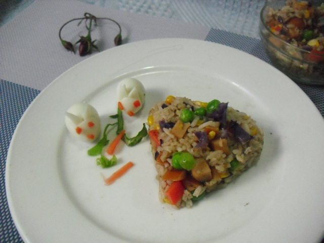 剩米饭1碗;火腿肠1小根;胡萝卜1/2根;玉米适量;豌豆适量;紫甘蓝少许;鹌鹑蛋3个;