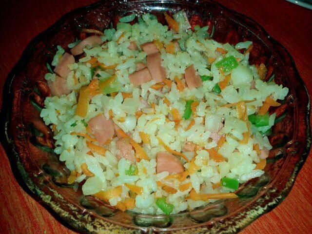 米饭150g;青椒35g;胡萝卜35g;洋葱35g;香肠35g;