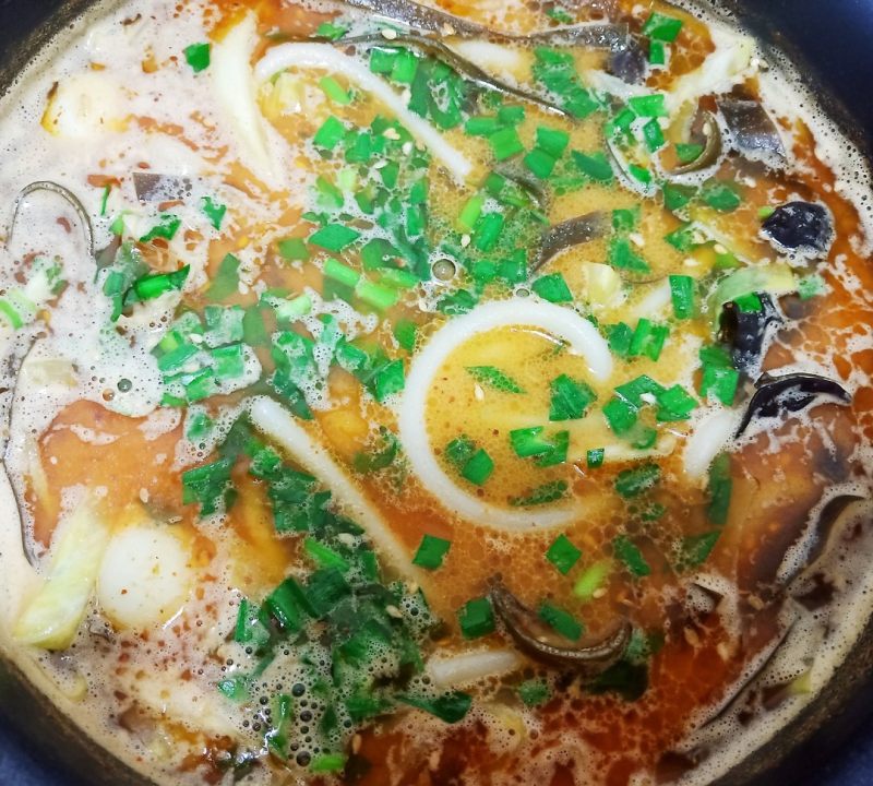 13:加入海带,木耳,银耳和包菜丝翻炒均匀。