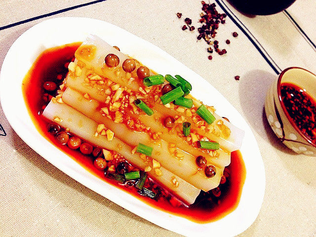 4:碗里加入葱末,生抽,醋,盐搅拌均匀,到在凉粉上,最后加上自制辣椒油。