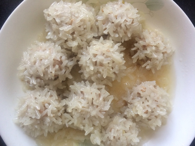 5:把调好的肉攒成一个丸子,然后放在糯米上滚一圈(糯米必须提前用水泡好至少5个小时),放在蒸锅上蒸至30分钟
