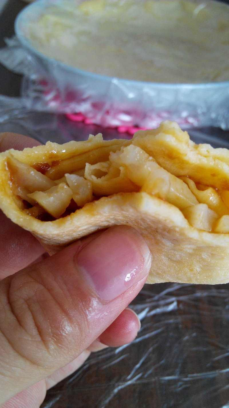 8:两面煎金黄色用筷子卷起即可(如果一次吃不完一定要放进保鲜盒内保持酥脆)
