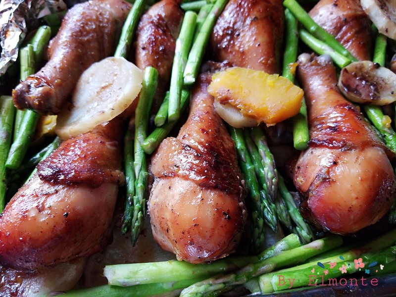 鸡腿8个;土豆2个;日本小南瓜1/4个;芦笋454g;