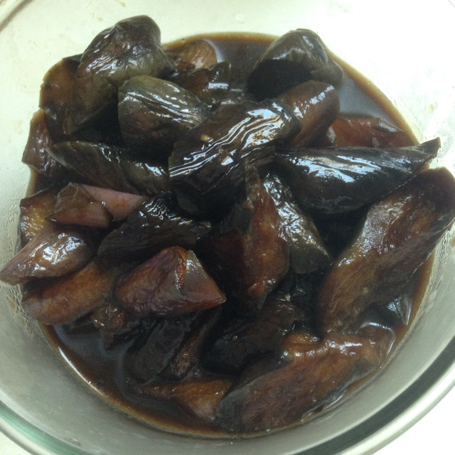 4:留少许底油,姜蒜炝锅,放入黄豆酱翻炒。茄子放入继续炒。