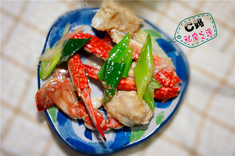 4:炒锅放少许油,下切好的葱姜翻炒几下,将炸好的蟹迅速放入翻炒5分钟。