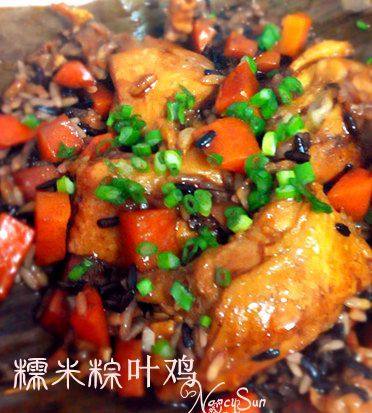 童子鸡一只;糯米50克;粽叶6张;胡萝卜1根;核桃仁20克;黑糯米50克;